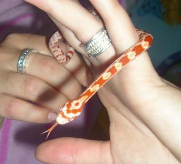 – Şerpii trăiesc cam 20-25 de ani. Cei din specia Corn Snake (Dizy şi Stich) pot ajunge până la teri metri; acum au în jur de un metru, dar sunt subţiri. Petch (boa) are deocamdată cca. 70 cm şi ajunge până la 5 metri, poate chiar mai mult. Depinde cum îi hrăneşti. Petch e foarte cuminte şi liniştit, dar muşcă destul de rău când e supărat. Ceilalţi doi sunt foarte agili şi rapizi, nu muşcă niciodată, aşa că nu sunt deloc periculoşi. Nu am avut probleme cu ei, atâta tot că Dizy a ieşit odată afară şi a trebuit să-l caut o zi întreagă.