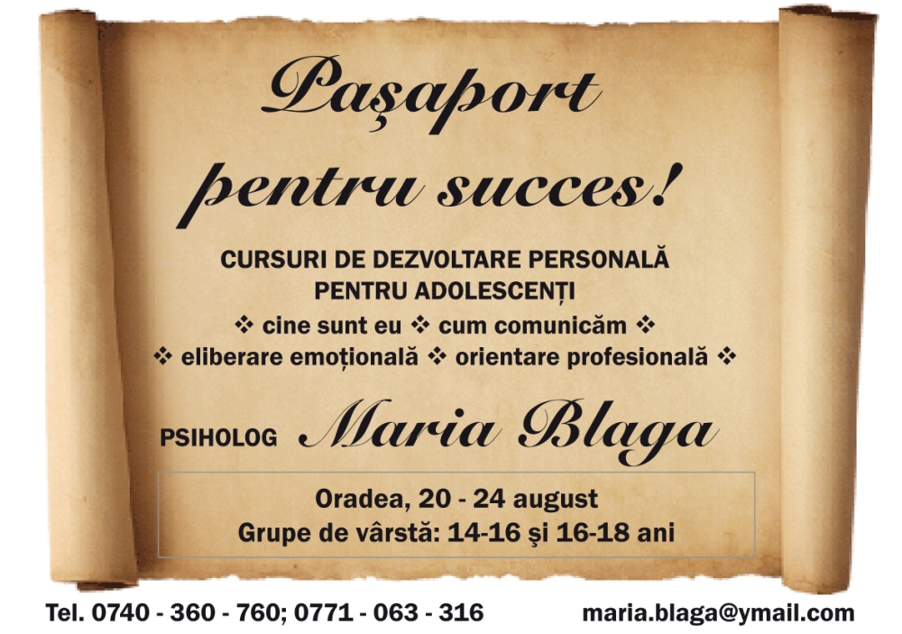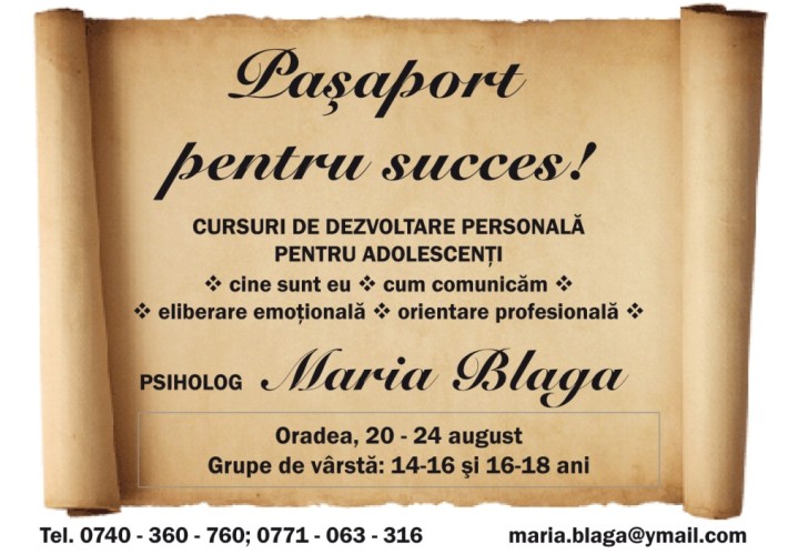 Psih. Maria Blaga organizează o serie de ateliere de dezvoltare personală pentru adolescenţi, reunite sub genericul „Paşaport pentru success”. Cursurile se desfăşoară de luni până vineri, pe grupe de vârstă: 14-16 ani, orele 14:00-15:30; 16-18 ani, orele 16:00-17:30.