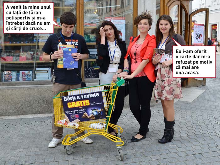 Fapte suspecte s-au petrecut în centrul oraşului Oradea de Ziua Internaţională a Cărţii. Câţiva tineri din Consiliul Judeţean al Elevilor, în loc să stea în bar şi să asculte manele, s-au dedat la acţiuni scandaloase, împărţind gratuit cărţi trecătorilor. Acest gest este o sfidare la adresa celor peste 80% din tinerii care la simularea de la BAC au reuşit să demonstreze că sunt tufe de Veneţia şi dacă sunt supravegheaţi video, şi dacă sunt lăsaţi de capul lor. I-am şi spus unei june vioaie care părea şefa acţiunii: „Bine că nu-s aici cei de la veritabilul Consiliu Judeţean, că vedeai tu cărţi în neştire, dar nu din alea de citit, ci din alea de sfetit”. Pun rămăşag că această manifestare nu a avut autorizaţie, dar poliţiştii nu se bagă când e vorba de cărţi, că le aduc aminte de chinurile studiului din ciclul primar…