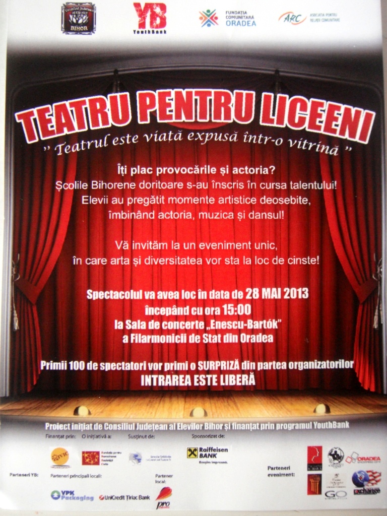 „Teatru pentru liceeni” va demonstra talentul tinerilor liceeni in actorie, muzica si dans, Spectacolul se va desfasura in incinta salii de concerte „Enescu-Bartok” a Filarmonicii de Stat din Oradea, incepand cu orele 15, intrarea fiind libera.