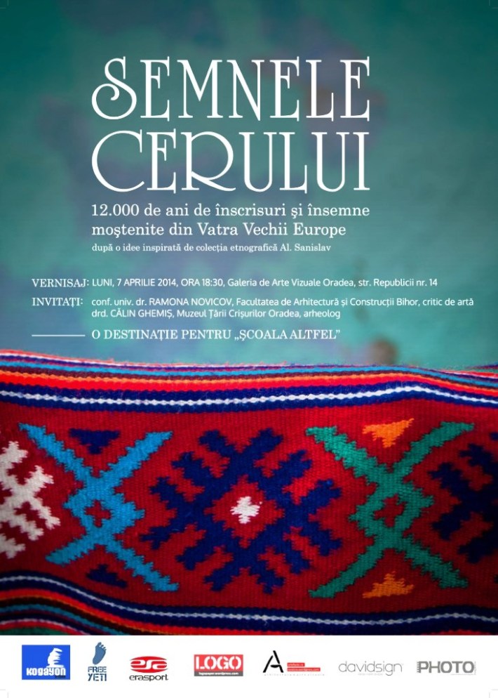 Expoziţia „SEMNELE CERULUI – 12.000 de ani de înscrisuri şi însemne moştenite din Vatra Vechii Europe” va fi vernisată luni, 7 aprilie 2014, ora 18:30, la Galeria de Arte Vizuale Oradea, str. Republicii nr. 15. Invitaţi: conf. univ. dr. Ramona Novicov, Facultatea de Arhitectură şi Construcţii Bihor, critic de artă, şi drd. Călin Ghemiş, Muzeul Ţării Crişurilor Oradea, arheolog.