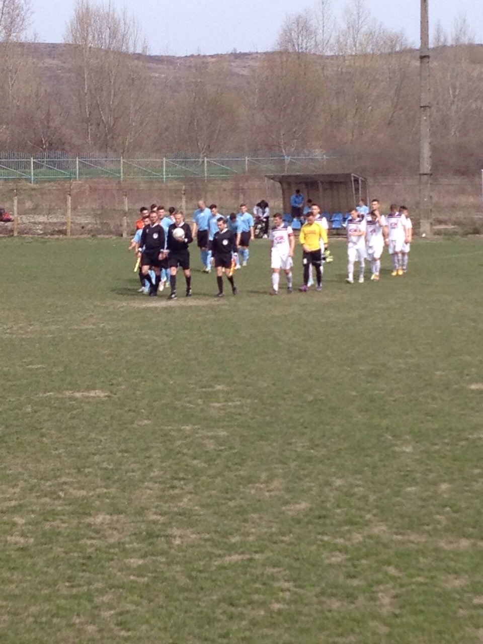 ACS Poli Timisoara (in albastru si negru) si FC Bihor Oradea juniori A (in alb) in momentul intrarii pe teren.