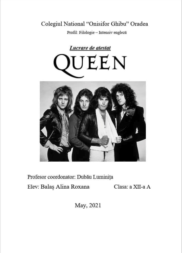 O mare parte din elevii clasei a Xll-a A, profilul filologie intensiv engleză, își prezintă în data de 27 mai lucrările de atestat la limba engleză. Dintre varietățile de teme din sfera culturii și civilizației britanice, Alina Balaș a decis să scrie despre celebra trupă britanică Queen.