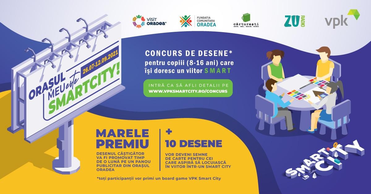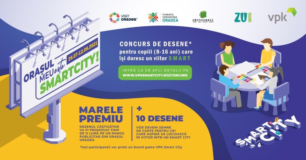Salonta, 29 iulie 2021 – Concursul național de desene “Orașul meu este Smart City” este organizat de VPK Packaging Salonta, in parteneriat cu Fundația Comunitară Oradea, fiind destinat copiilor între 8 și 16 ani din întreaga țară. Acesta se va desfășura între 26 iulie și 12 septembrie pe www.vpksmartcity.ro/concurs, iar premiul cel mare va oferi posibilitatea celui mai votat desen să se regăsească timp de o lună pe panouri din orașul Oradea; următoarele 10 desene cu cel mai mare număr de voturi vor fi reproduse pe semne de carte ce vor fi oferite vizitatorilor librăriilor Cărturești din mai multe județe. În plus, toți participanții vor primi gratis un board game VPK Smart City.
