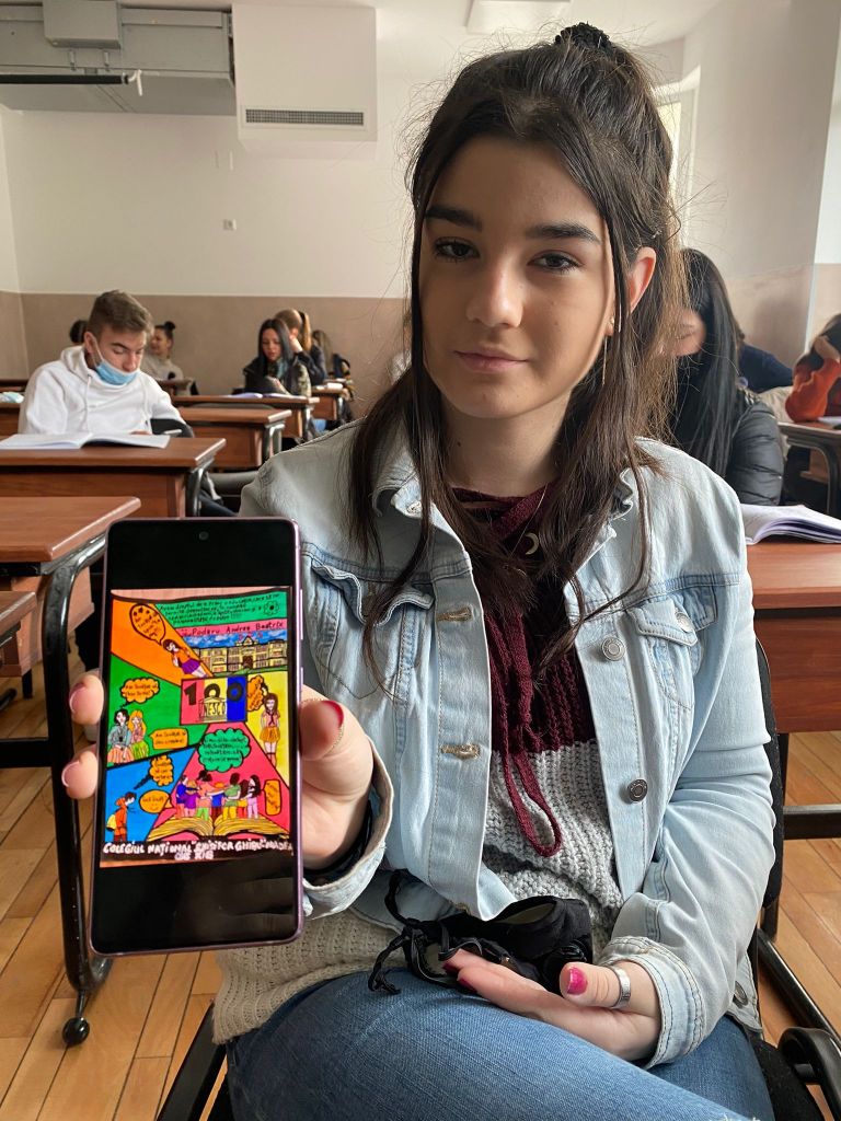 Andrea ne-a spus câteva cuvinte despre modul în care a creat această imagine “Am folosit creion, tempera și carioca. Ceea ce vedeți este a doua versiune. În prima erau redate câteva biserici și mânăstiri din România, dar doamna profesoara îndrumătoare mi-a spus că este un subiect mai greu de abordat plastic, așa că am ales o soluție mai accesibilă”.