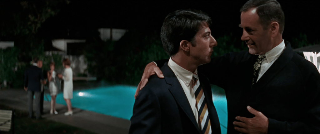 Mai presus de orice altceva, The Graduate se remarcă prin utilizarea inedită a simbolului apei. În prima scenă din casa familiei Braddock, Ben este surprins stând în camera sa, în fața acvariului. Privirea îi este inexpresivă și ne putem da seama cât e de îngândurat. Cadrul ne spune, printr-un limbaj unic, tot ce trebuie să știm despre personaj – cu toate că e înconjurat de un ocean de oameni, tânărul se simte la fel de neînsemnat precum un peștișor. Simte că se îneacă. E copleșit de tot ceea ce e îl înconjoară. În schimb, secvența de la piscină, în care Ben e nevoit să intre în apă cu costumul ridicol de scafandru, ar putea semnifica eforturile lui Braddock de a ieși la suprafață, de a găsi un răspuns la problemele care-l macină. După ce Ben are parte de prima aventură cu doamna Robinson, îl vedem plutind la suprafața apei pe o saltea gonflabilă, idee care sugerează faptul că tânărul și-a găsit, în sfârșit, liniștea. Atunci când părinții lui Braddock insistă ca Ben să o scoată pe Elaine la o întâlnire, acesta se scufundă din nou, pentru că realizează gravitatea și consecințele faptelor sale.