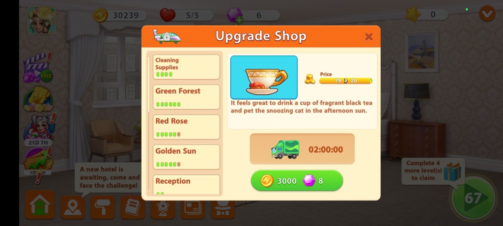 După ce ați terminat personalizarea camerei, cu banii și diamantele rămase puteți sa faceți upgrade la diferite arii ale hotelului, pentru a îmbunătăți timpul realizării diferitor sarcini.