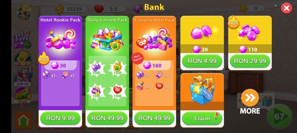 Inițial, cand am instalat-o, nu mă așteptam sa fie atat de interactivă. Jocul funcționează prin conectare cu Facebook, pentru a nu pierde contul, și să primești diamante bonus pe care ulterior le poți folosi în upgrade-urile necesare pentru camerele de hotel.