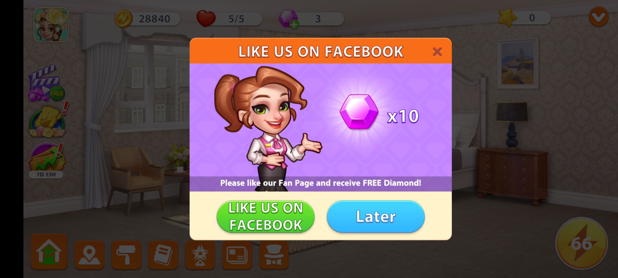 Inițial, cand am instalat-o, nu mă așteptam sa fie atat de interactivă. Jocul funcționează prin conectare cu Facebook, pentru a nu pierde contul, și să primești diamante bonus pe care ulterior le poți folosi în upgrade-urile necesare pentru camerele de hotel.