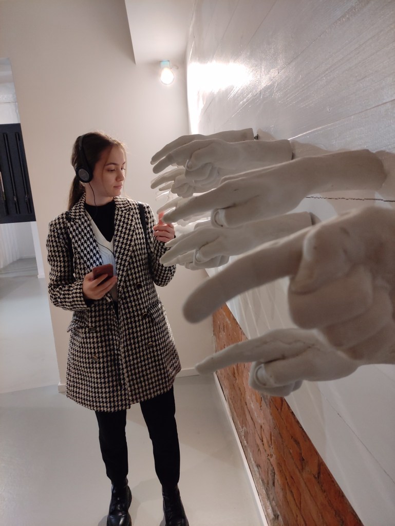 Pe urmă, am intrat într-o încăpere amenajată care semăna a sinagogă. Ce m-a impresionat totuși au fost locurile și evenimentele redate de ochelarii VR amplasați în câteva zone a muzeului. A urmat și o expoziție de lucruri care au avut cândva un proprietar, așa am ajuns să privesc cu sfială haina unei victime care acum mărturisește în locul ei. Un deținut, un evreu care a avut un nume și a fost schimbat într-un număr – A13613.