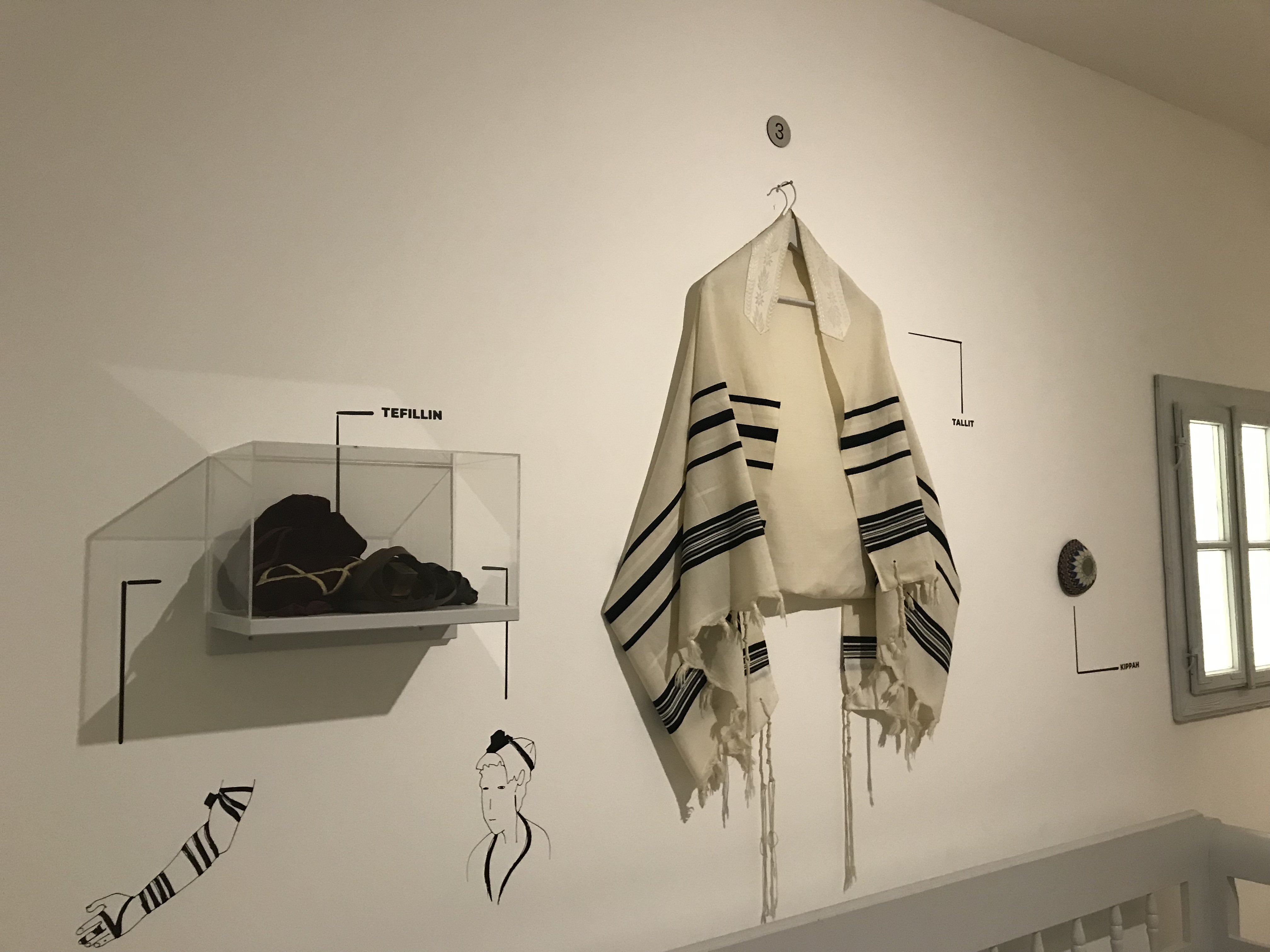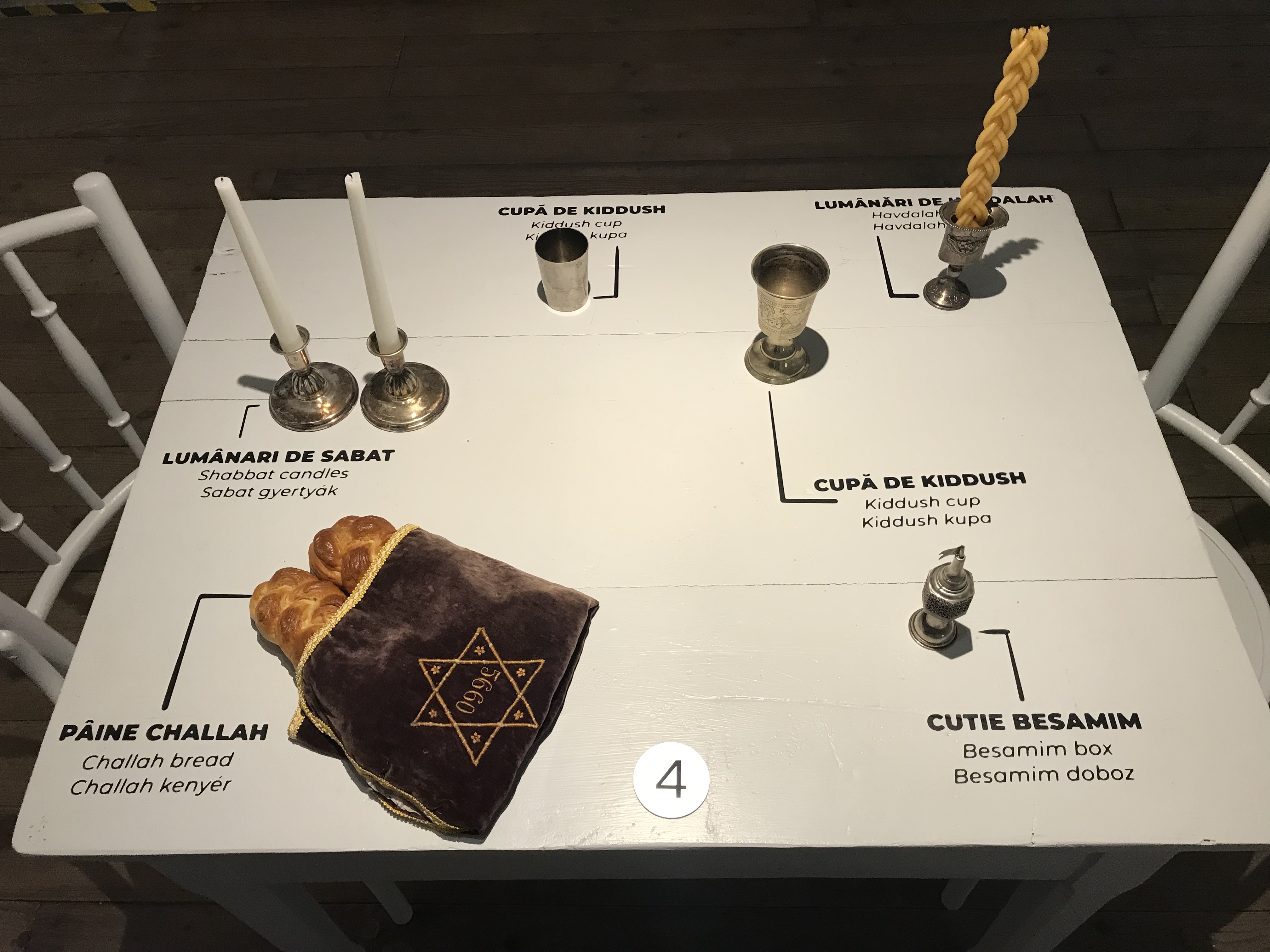 Într-o cameră care am găsit elemente specifice evreilor (pâine Challah, lumânări de Shabbat, cupă de Kiddush, tallit, kippah etc).