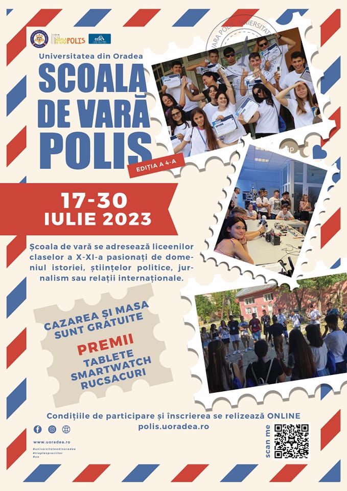 Universitatea din Oradea organizează în perioada 17-30 iulie cea de-a patra ediție a Școlii de vară Polis. În cadrul acestei școli de vară sunt așteptați liceenii din clasele a X-a și a XII-a care sunt pasionați de domeniul istoriei, științelor politice, jurnalism sau relații internaționale.
