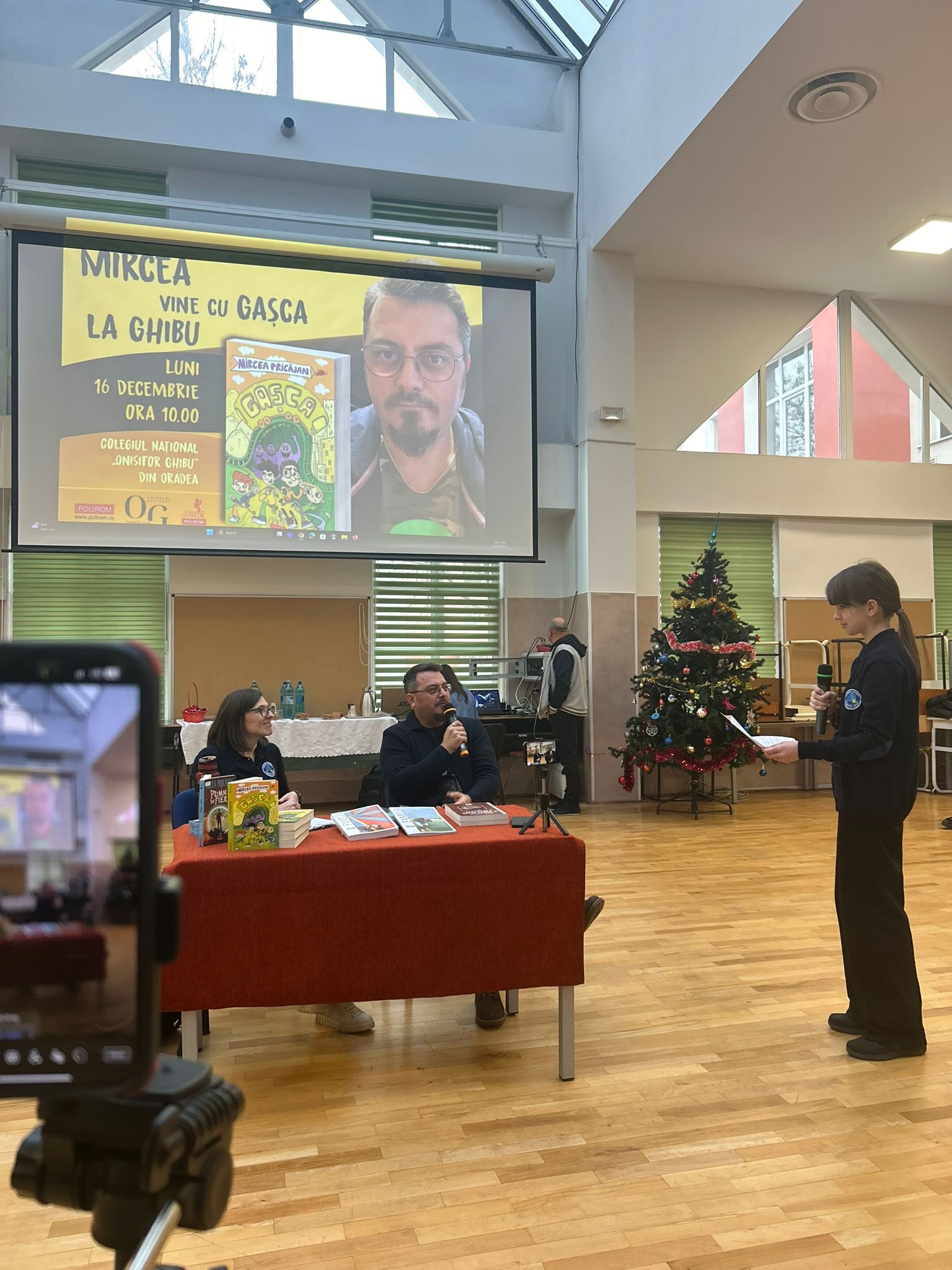 Primul maestru de ceremonii a fost Irina Puie (clasa a VIII-a B), care a vorbit despre invitatul colegiului nostru. Apoi a luat cuvântul Mircea Pricăjan. Domnia-sa ne-a vorbit despre una dintre cărțile sale anterioare, scrisă tot pentru publicul tânăr, și a avut bucuria să constate că în sală se aflau mulți cititori familiarizați cu aceasta (Pumn de fier).