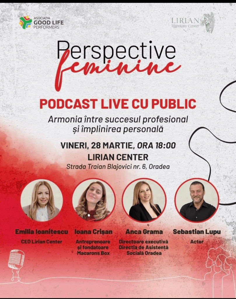 Pe data de 28 martie, am participat la un eveniment special dedicat femeilor profesioniste, unde am descoperit povești inspiraționale și perspective valoroase. Cu tema ,,Armonia succesului profesional și a împlinirii personale”, acest eveniment a adus în fața publicului patru speakeri de excepție: Anca Grama, Emilia Ioanițescu, Ioana Crișan și Sebastian Lupu.