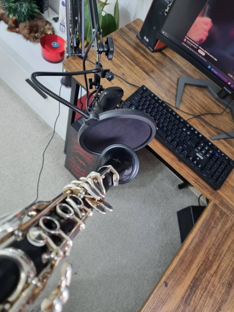 Înregistrarea clarinetului într-un studio necesită o abordare atentă, pentru a reda fidel tonul său cald și expresiv. Se recomandă utilizarea unui microfon condensator cu diafragmă mică, poziționat la o distanță de 30-50 cm, ușor deasupra sau dedesubtul instrumentului, orientat spre zona dintre cheia de mijloc și pavilion.