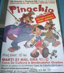 AS Events si Teatru DA Resita va invita marti, 21 mai, ora 10 si 12, la spectacolul de teatru pentru copii cu piesa „Pinochio”. Piesa va avea loc la Casa de Cultura a Sindicatelor Oradea. Biletele se gasesc la secretariatul